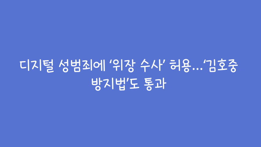 디지털 성범죄, 위장 수사 허용 디지털 성범죄 수사 강화, '김호중 방지법' 통과국회는 디지털 성범죄 수사를 강화하고 음주운전 처벌을 강화하는 법안들을 통과시켰습니다. 이제는 연령에 관계없이 함정수사를 통해 디지털 성범죄를 단속할 수 있게 되었습니다. 또한, 음주운전 후 추가로 술을 마셔 음주측정을 방해하는 행위를 처벌하는 이른바 '김호중 방지법'도 통과되어 앞으로 음주운전 처벌이 더욱 강화될 것으로 보입니다. 디지털 성범죄 수사, 성인 대상으로 확대개정된 성폭력처벌법은 디지털 성범죄 수사 대상을 아동, 청소년에서 성인으로 확대했습니다. 이는 최근 딥페이크 등 디지털 성범죄가 심각해지면서 일반적인 수사만으로는 증거 확보와 범죄자 검거가 어렵다는 지적에 따른 조치입니다. 경찰은 신분을 밝히지 않..